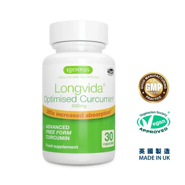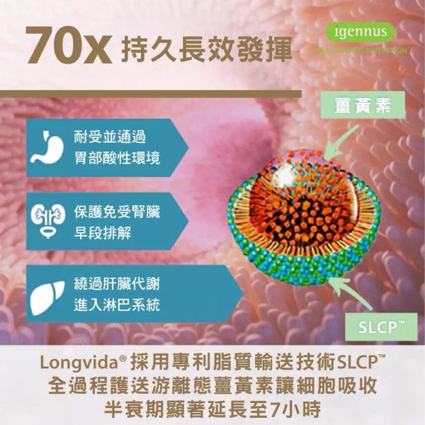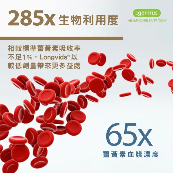 高劑量游離態薑黃素 Longvida® 優化薑黃素 提供游離態薑黃素,能直接輸送至淋巴系統,確保於人體內達到臨床有益水平。