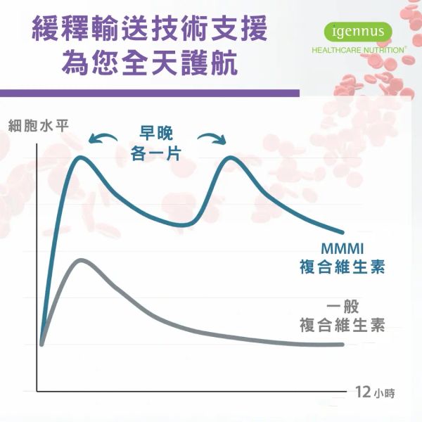 全天護航 MMMI 高吸收配方採用緩釋輸送技術,持續穩定地優化血液營養水平以獲得最大健康益處,讓您安心無憂。
